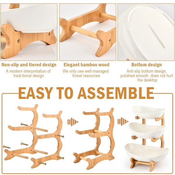 The sturdy wood frame keeps all three tiers firmly in place, preventing wobbling or tipping even when filled. Its open design allows easy access to items from any angle, making it ideal for serving fruits, desserts, or snacks during meals and gatherings.
